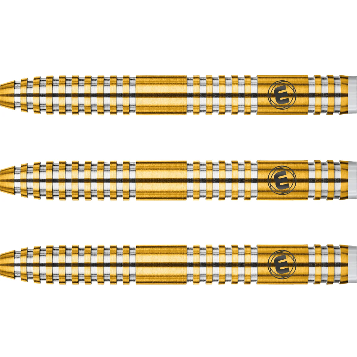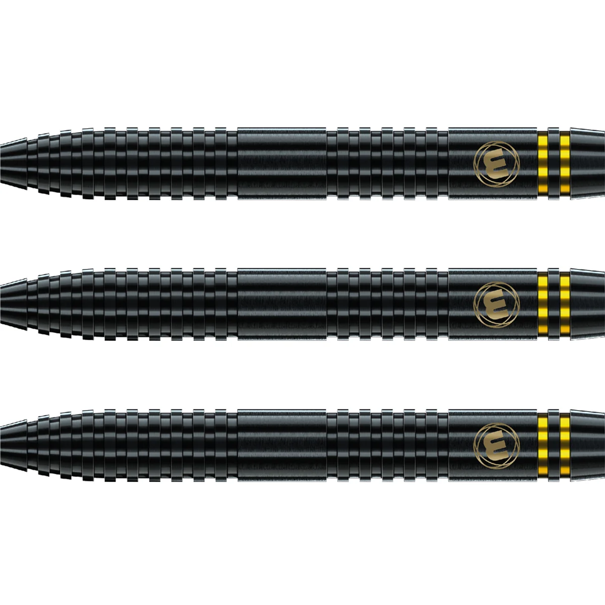 Die schwarzen Daryl Gurney Steeldarts von Winmau haben einen gerade verlaufenden, etwas längeren Barrel mit einem Tungstengehalt von 90%. Der ideale Dartpfeil wenn Du die Finger beim greifen der Darts etwas weiter auseinander hältst. Auf den hochwertigen Daryl Gurney Black Edition Steeldarts sind zwei Ringedgrip Zonen zu finden die von den Einkerbungen nicht sonderlich tief sind und deshalb für ein angenehmes Wurfgefühl sorgen. Allerdings ist der Grip dadurch nicht ganz so scharf. Die beiden Griffzonen der Winmau Darts sind optimale Anhaltspunkte und helfen beim konstanten greifen was den Wurf präzisiert.Die Darts sind mittig ausgewogen und vereinen perfekte Flugeigenschaften mit Präzision wie es bei der Top Darts Marke Winmau Standard ist. Erhältlich sind diese professionellen Darts als 23 oder 25 gramm Dartset.Neben den schlanken 90% Tungsten Daryl Gurney Barrels sind im Set noch ein Satz Prism Force Dartschäfte und ein Satz Spielerflights enthalten damit Du Dich sofort ans Board stellen kannst. Das angegebene Gewicht bezieht sich auf die Barrels und beträgt im komplett montierten Zustand ca. 2gramm mehr, je nachdem welches Zubehör Du verwendest.GewichtBarrellängeDurchmesser25 gramm54,6 mm6,6 mm