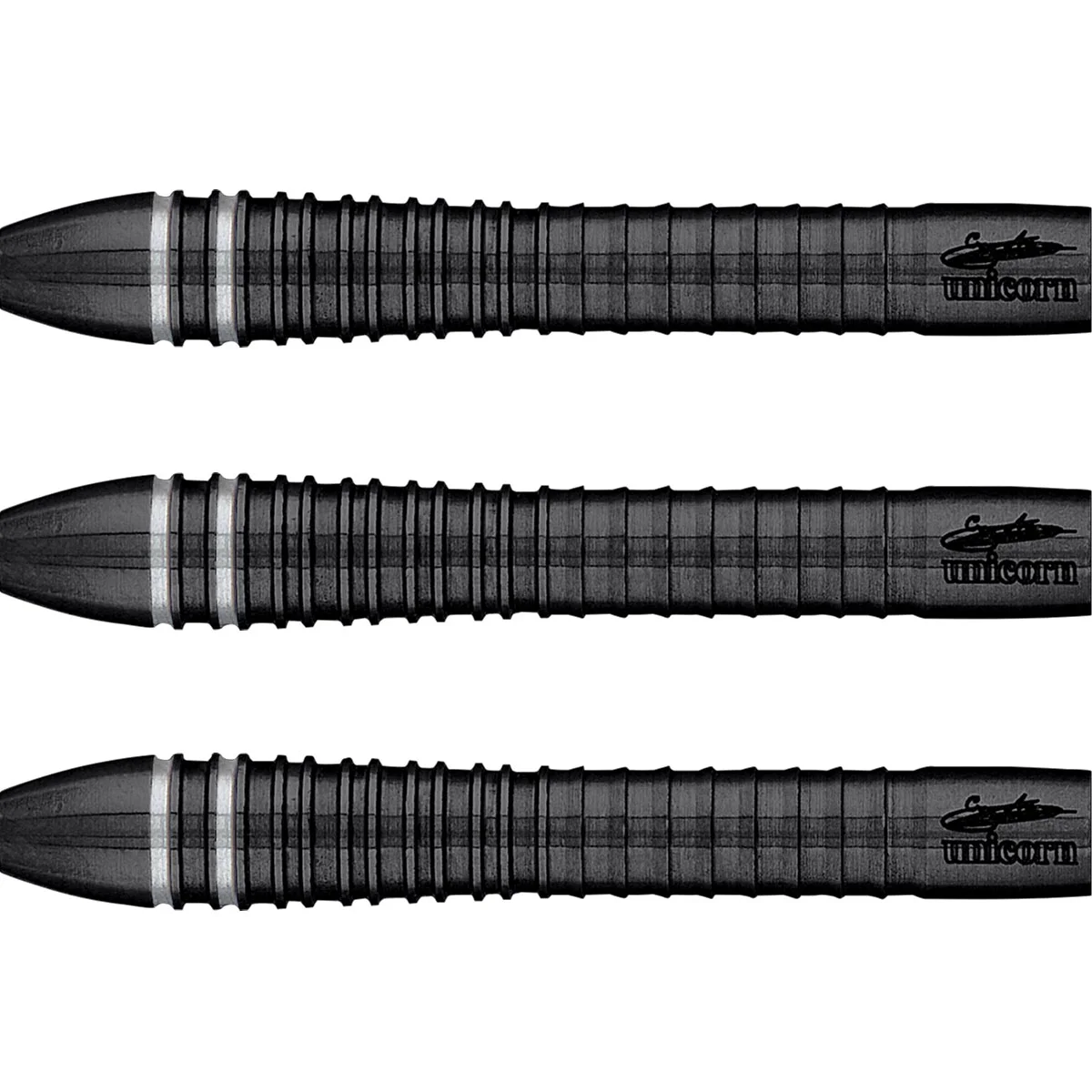 Die neuen Gary Anderson Steeldarts Noir Phase 6 werden aus einem hochwertigen 90% Tungsten Barrel gefertigt der zwei unterschiedliche Griparten aufweist. Das Torpedoförmige Profi-Barrel ist am vorderen Teil mit einem Doppel-Ringedgrip versehen, während die Haupt-Gripzone mit einem abgeflachten Shark-Grip ausgestattet ist.Dadurch wird eine optimale Kontrolle über die Darts erreicht was sich dennoch angenehm und nicht zu aggressiv anfühlt. Die schwarze Beschichting verleiht den Gary Anderson Darts eine besondere Eleganz und schützt sie gleichzeitig vor Abnutzung.Ausgeliefert werden die Unicorn Darts in einer schönen Geschenkverpackung.GewichtBarrellängeDurchmesser22g48,5mm7,2mm24g50,7mm7,3mm