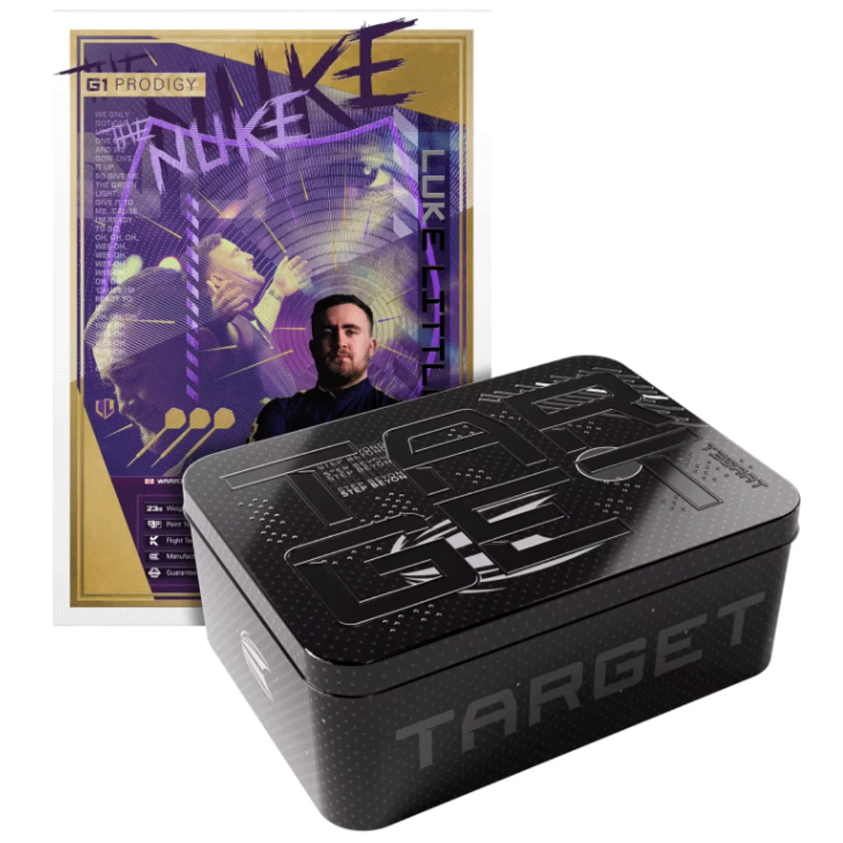 Target Luke Littler G1 Prodigy Swiss Point Steeldarts – Präzision und Eleganz vereint Die Target Luke Littler G1 Prodigy Steeldarts, mit einem beeindruckenden 90% Tungsten-Anteil, wurden in Zusammenarbeit mit „The Nuke“ entwickelt und bieten sowohl Sammlern als auch Spielern maximale Präzision. Das Design dieses Dartsets besticht durch elegante goldene Akzente und exklusive UV- sowie Folienverzierungen, die für Langlebigkeit und eine einzigartige Optik sorgen. Innovative Features für höchste Performance Die Barrels sind gerade geformt und mit der patentierten Pixel-Grip-Technologie ausgestattet, die für optimalen Halt sorgt. Besonders hervorzuheben ist der hintere Teil mit einem scharfkantigen Ringgrip, ideal für Reargripper. Die aufwendig gestalteten Pixel innerhalb der Pixel, kombiniert mit den in Silber gehaltenen Vertiefungen, verleihen den Darts einen faszinierenden Look, insbesondere im Licht. Das Set kommt mit dem Swiss Point System, das den schnellen Wechsel der Spitzen in wenigen Sekunden ermöglicht. Dank eines cleveren Verriegelungssystems bleiben die Spitzen während des Spiels sicher fixiert. Ein weiteres Highlight: Bei einem Bruch der Spitze sorgt eine strategisch platzierte Nut dafür, dass der Rest einfach entfernt werden kann. Mit den beiliegenden 26mm und 30mm Swiss DX Points Spitzen hast du immer die richtige Wahl für dein Spiel. Exklusive Sammler-Edition in edlem Design Diese erste Sammleredition von Luke Littler wird in einer eleganten, schwarzen Collector Box präsentiert und kommt mit lila K-Flex Flights sowie einem hochwertigen Swiss Point Tool. Zudem erhältst du einen Gutschein für ein 1-monatiges Premium-Abo bei Dartscounter, um dein Spiel auf das nächste Level zu bringen. Lieferumfang: 3x Luke Littler G1 Prodigy Barrels (23g) 3x exklusive K-Flex Flights Signature Littler No2 3x goldene Swiss Points DX 26mm 3x goldene Swiss Points DX 30mm 1x Premium Swiss Point Tool 1x Schwarze Collector Box 1x Gratis Dartscounter Premium-Abo (1 Monat) Luke Littler Prodigy - Perfekte Balance aus Design und Funktionalität – für Spieler, die nur das Beste wollen.GewichtBarrellängeDurchmesser23g52mm6,5mm