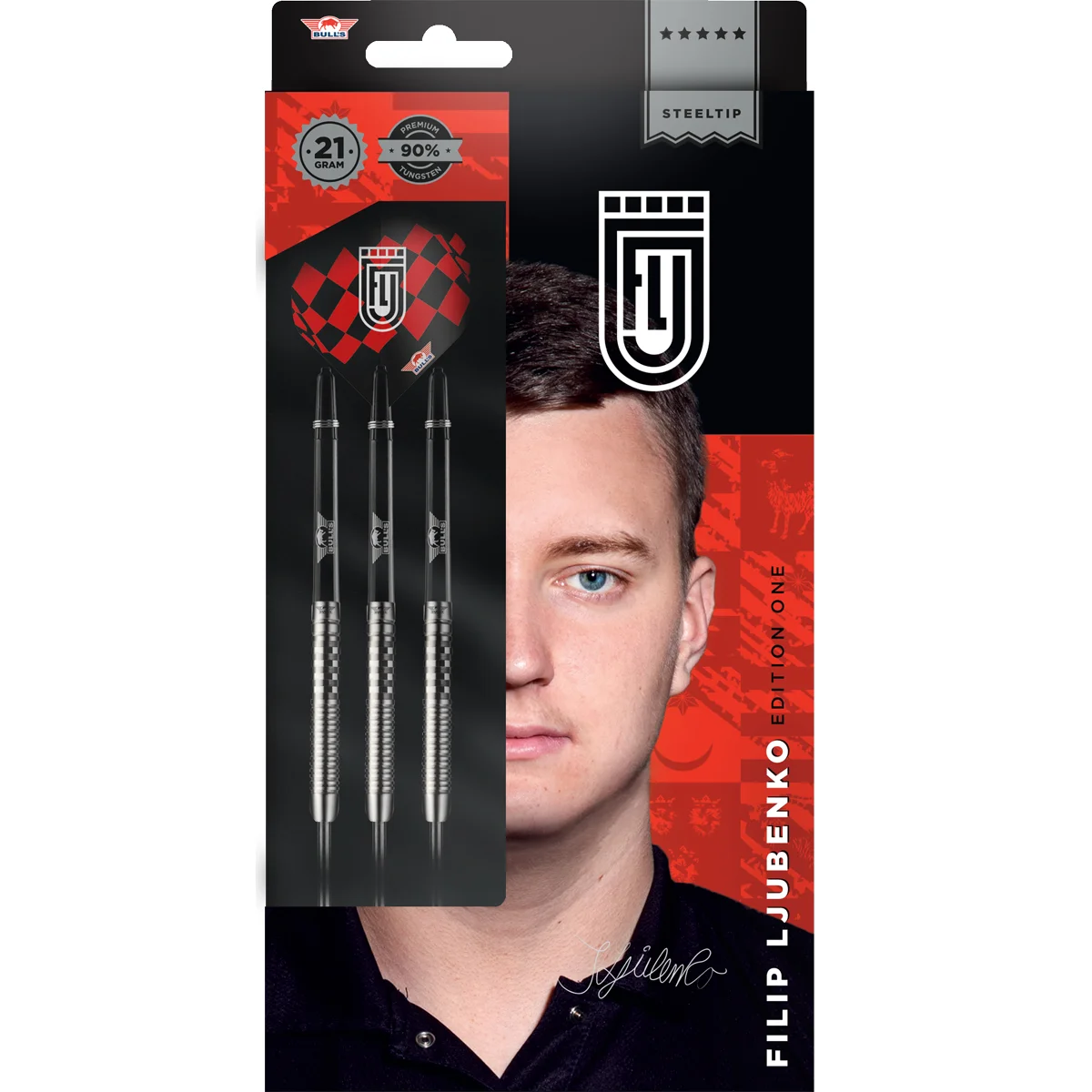 Die Filip Ljubenko Steeldarts sind mit einem Gewicht von 21 und 23 gramm erhältlich das sich nur auf die Barrels bezieht. Im Set enthalten sind neben den hochwertigen Barrels zusätzlich Bull´s NL Nylon Shafts und Filip Ljubenko Spielerflights.