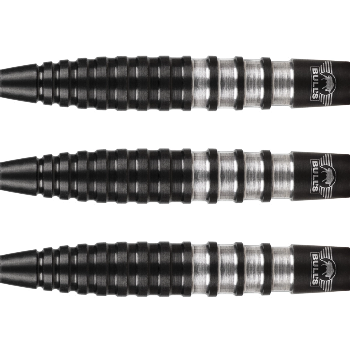 Der vordere Bereich der Barrels ist mit präzise eingearbeiteten Ringen versehen, die für einen festen Griff sorgen. Der hintere Bereich ist mit breiteren Ringen ausgestattet, um den Halt zu verbessern wenn man die Darts gerne weiter hinten greift.Die Ausbuchtungen am hinteren Teil des Barrels sind in Silber gehalten, während der restliche Dart in zeitlosem Schwarz erstrahlt. Das mittig ausbalancierte Design bietet eine gleichmäßige Gewichtsverteilung, was die Wurfgenauigkeit erhöht.