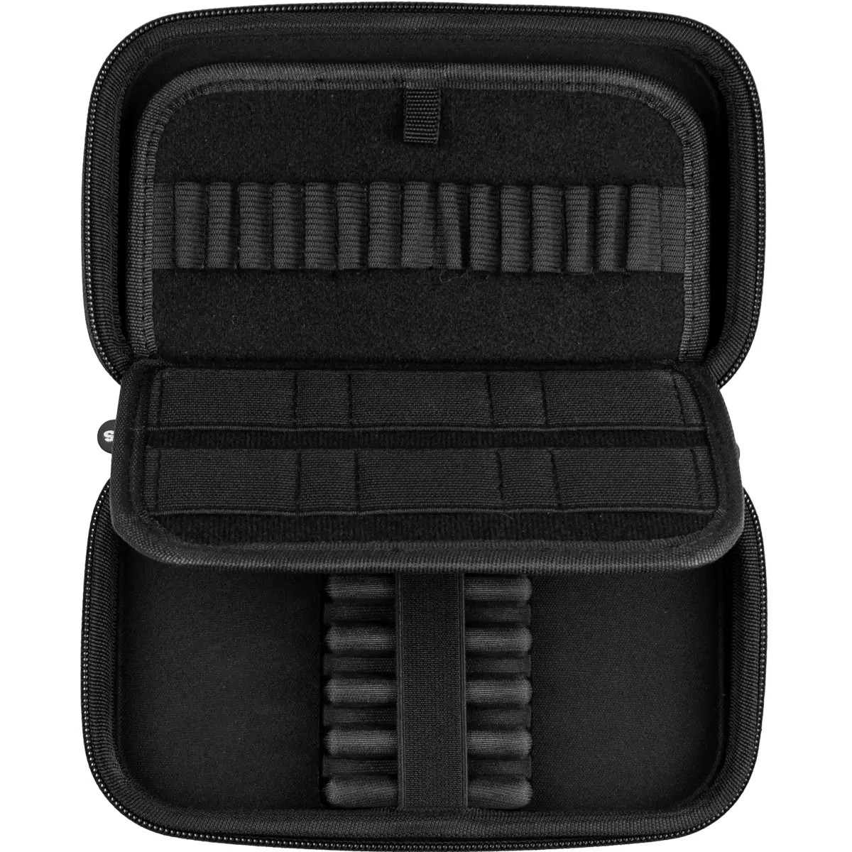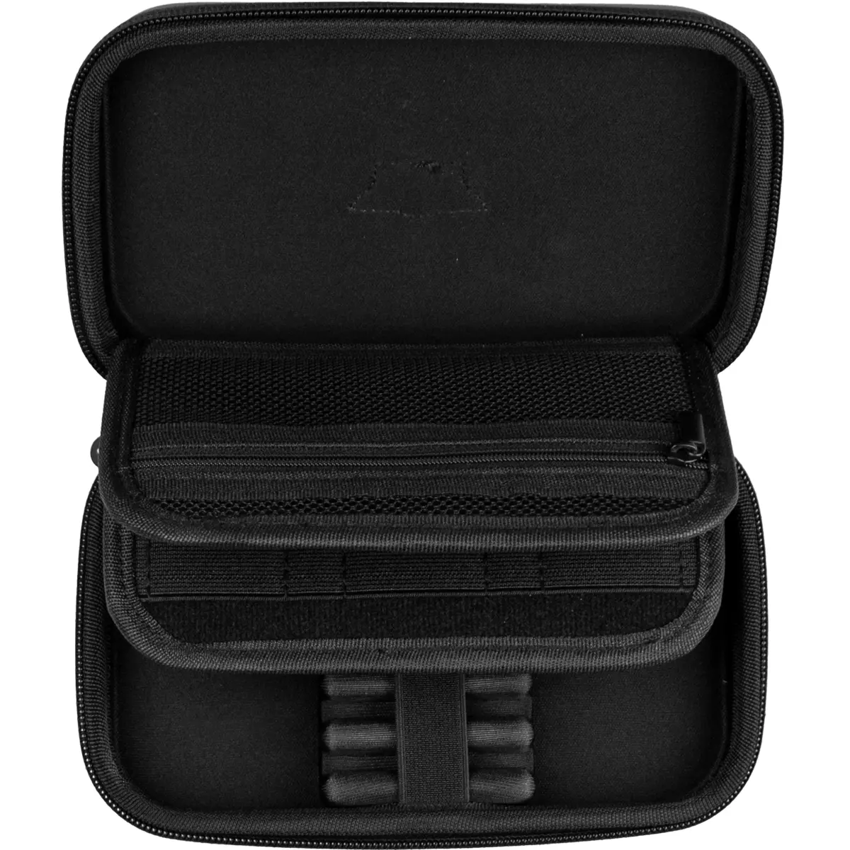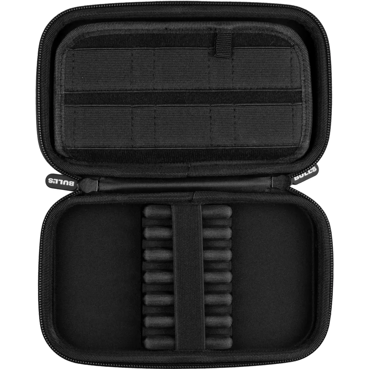 Größe: 19,5 × 11,5 × 4,5 cm. Innen bietet das Case eine klare Struktur: Schaumstoffblock für sicheren Halt der Darts, zwei klappbare Inlays für Zubehör sowie eine Netztasche mit Zipper – alles an seinem Platz, nichts geht verloren.