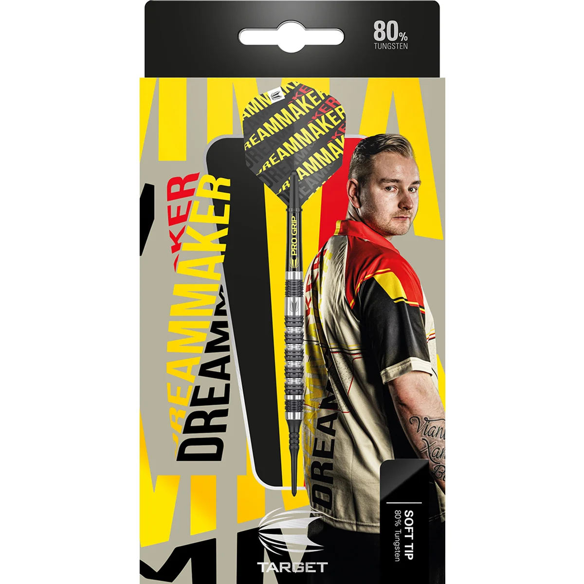 Ganz vorne bei den Dartspitzen und ganz hinten zu den Shafts ist jeweils ein Doppel Ringed Grip der als Anhaltspunkt dient und die Fläche des Greifens vergrößern kann. Trotz der leichten Torpedoform sind die Dimitri van den Bergh 80% Softdarts mittig ausgewogen.