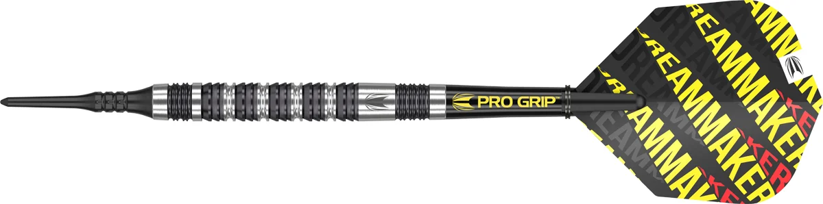 Die 80% Tungsten Dimitri van den Bergh Softdarts vereinen zwei der beliebtesten Grip-Arten auf einem leicht bauchigen Barrel. Für den optimalen Halt und bestmögliche Griffigkeit sorgt der Shark Grip der an vier stellen durch einen silber eingefärbten Ringed Grip unterbrochen wird. Ideale Orientierungspunkte zum greifen dieser eleganten und stilvollen Darts.