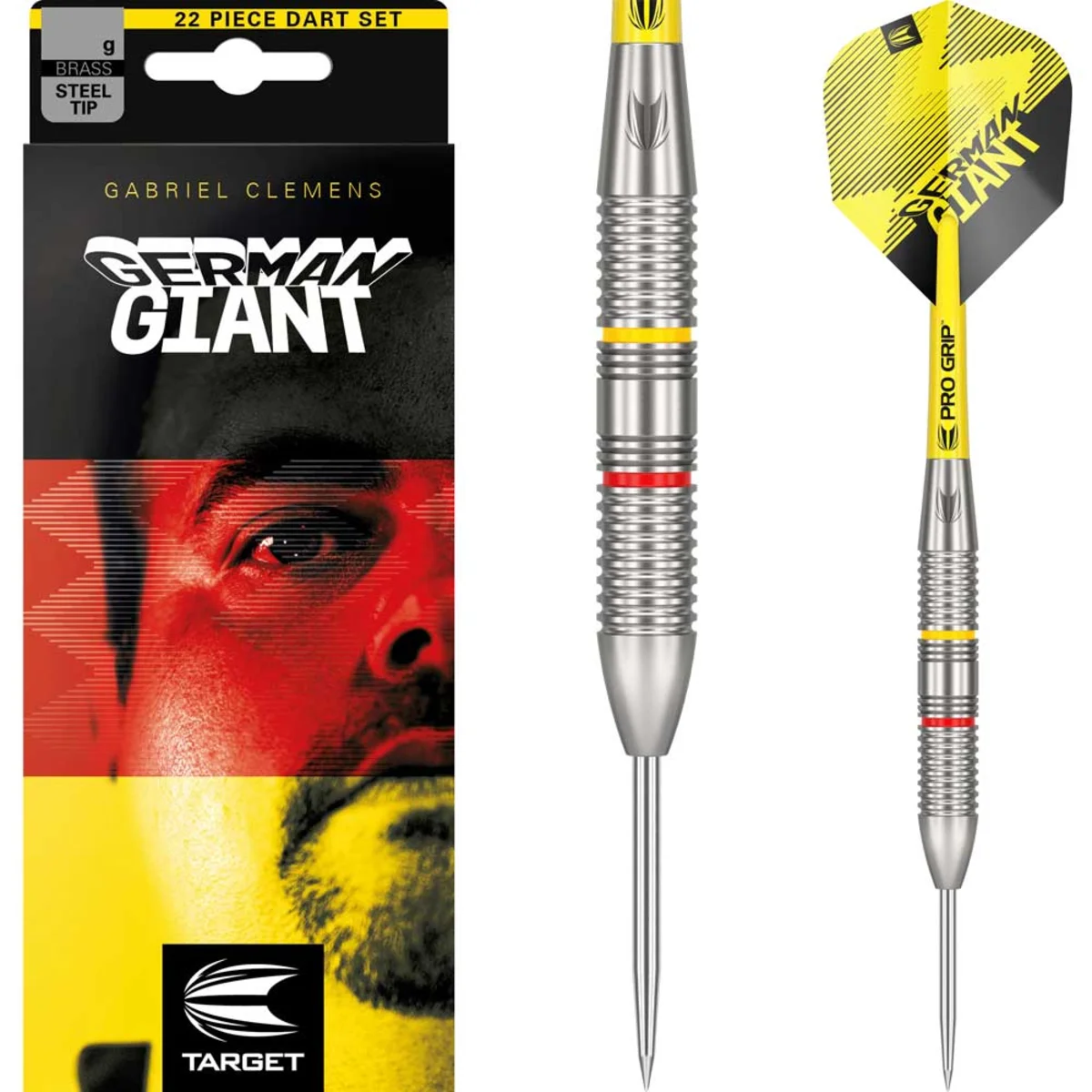 Die Target Gabriel Clemens Brass Steeldarts bringen gleich das nötige Dartzubehör mit das man für den Anfang braucht. Neben den drei Brass Steeldarts im coolen German Giant Look werden außerdem 9 Flights, 9 Dartschäfte und eine praktische Darttasche mitgeliefert. Die Gabriel Clemens Dartpfeile haben einen angenehmen Ringed Grip der gerade am Anfang sehr angenehm zu spielen ist und hilft den persönlichen Stil zu entwickeln.