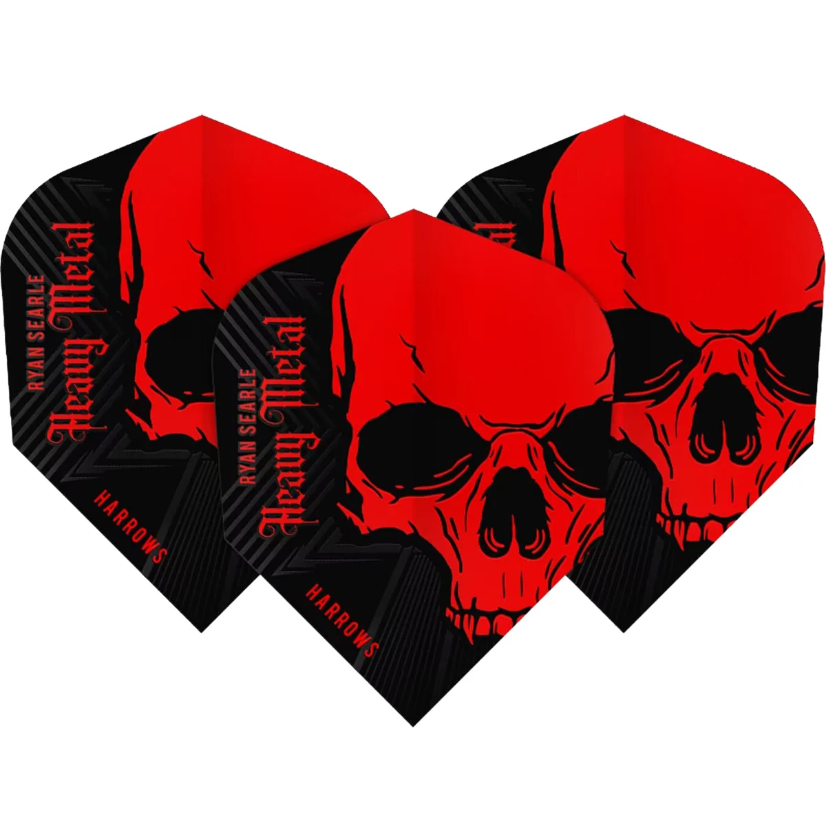 Ryan Searle Flights von Harrows im typischen Heavy Metal Look mit einer Flightstärke von 100 Micron in der etwas schmaleren Shape Form.