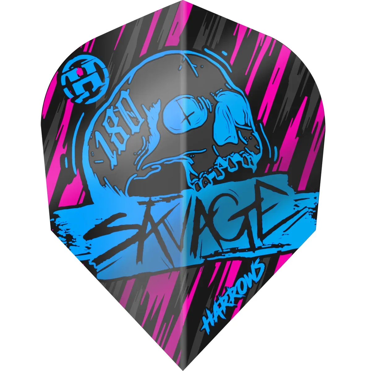 Harrows SAVAGE Flights in der schmalen Standard Form Shape (N°6) mit einer Stärke von 100 Micron. Vier aufregende, kräftige Designs für Deinen persönlichen Stil.