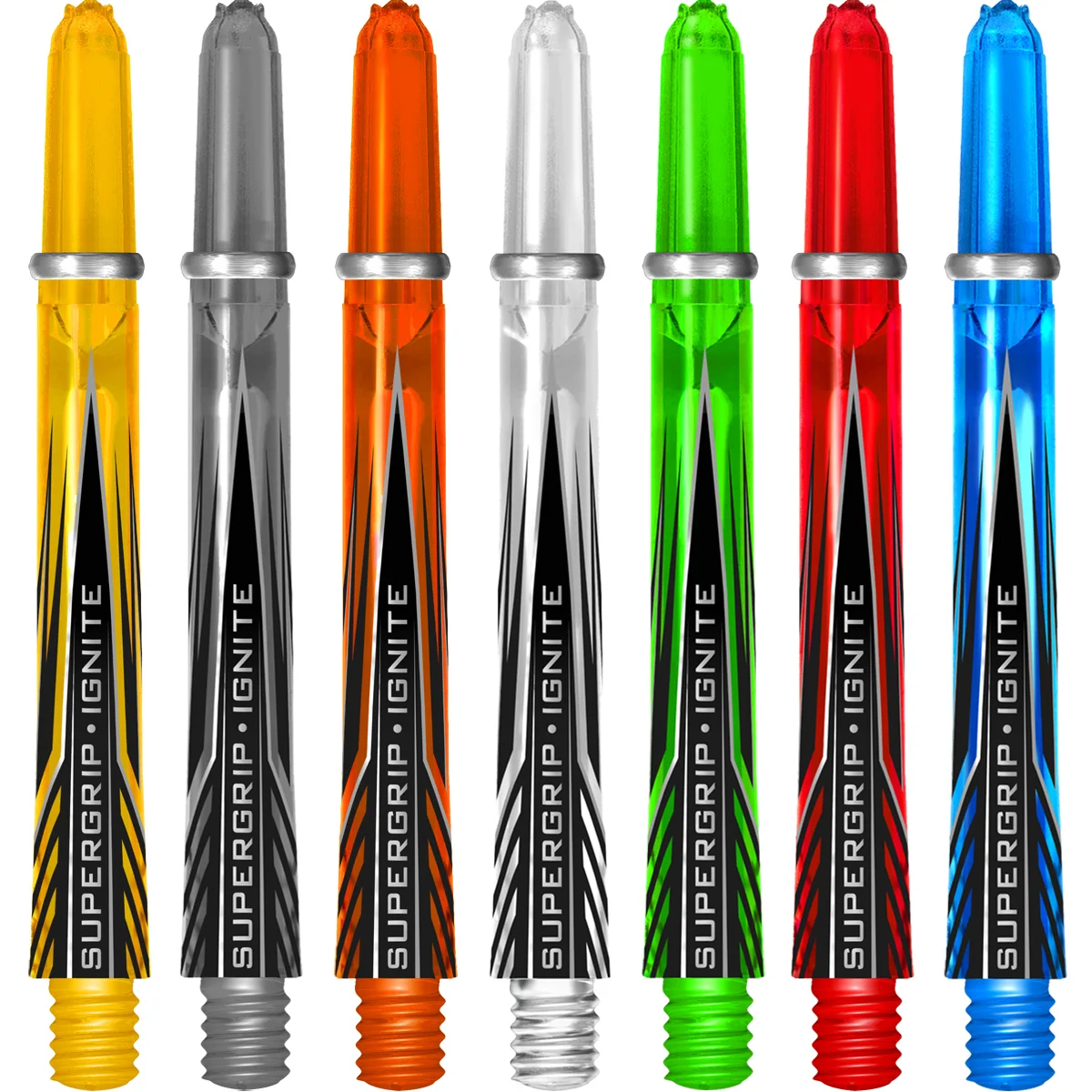 Für den persönlichen Geschmack und Stil gibt es die Supergrip Ignite Shafts in 7 halbtransparenten Farben. Bereits ab Werk ist auf jedem Shaft ein Supergrip-Ring vorinstalliert der als Slot Lock Ring oder einfach so eingesetzt werden kann um den Flights noch mehr Halt zu geben.