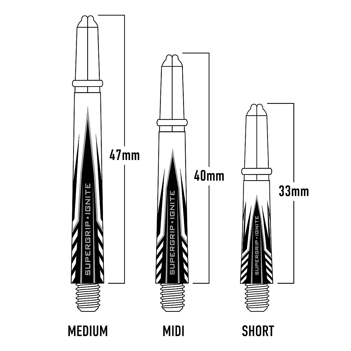 Die Shafts sind in drei verschiedenen Längen erhältlich, um den individuellen Vorlieben und Spielstilen gerecht zu werden. Die Montage der SuperGrip Ignite Dart Shafts ist einfach und sicher. Sie verfügen über das übliche 2BA Gewinde, das eine schnelle und zuverlässige Befestigung an den Dartbarrels ermöglicht. Dadurch sitzen die Shafts fest und stabil, ohne sich während des Spiels zu lockern.