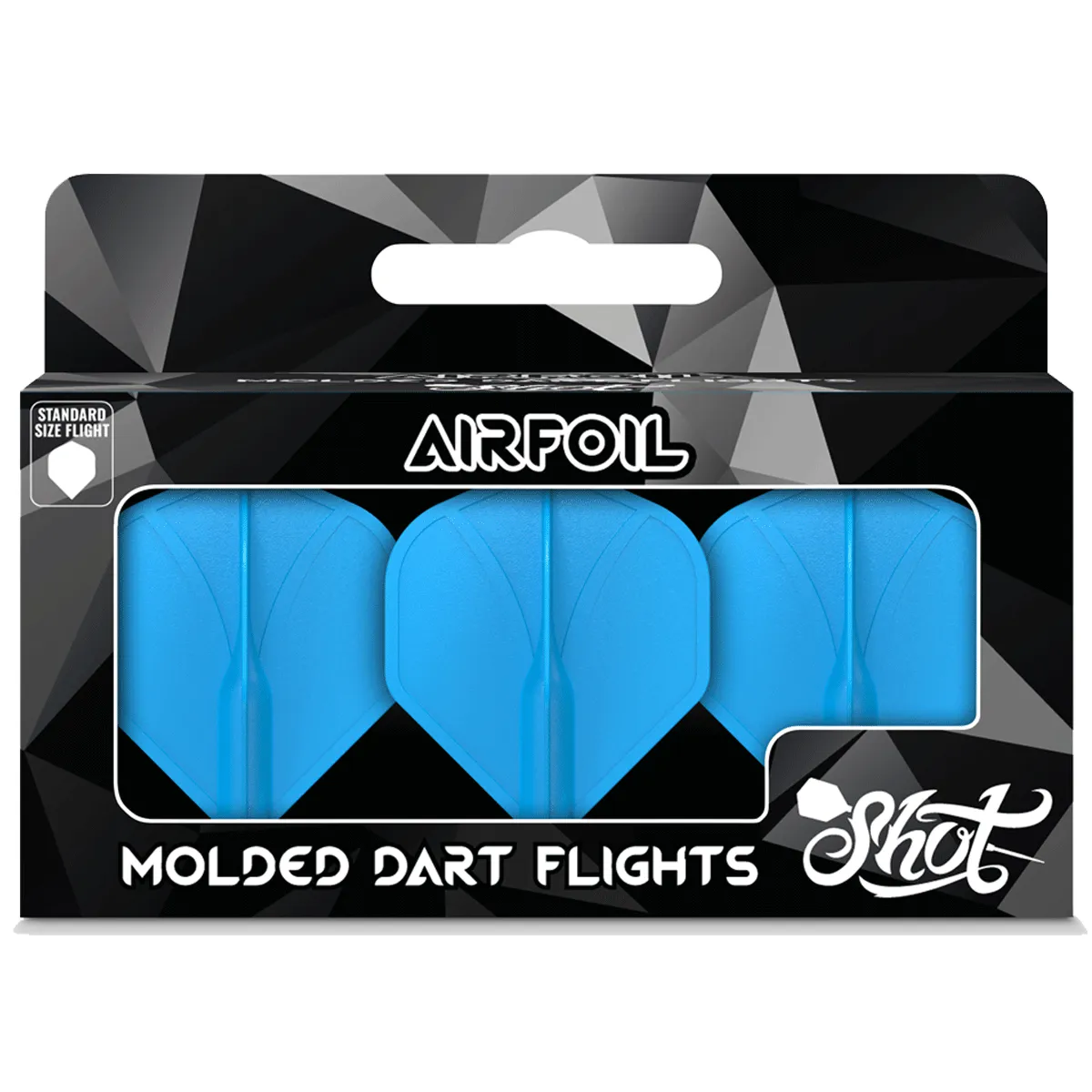 Der optimale 90-Grad-Flugwinkel der Shot Airfoil Flights blau bleibt bei jedem Wurf erhalten. Hergestellt aus einem fortschrittlichen kompositen Polymer, sind diese neuen One-Piece Flights flexibel, aber auch widerstandsfähig gegenüber den intensivsten Dartspielen.