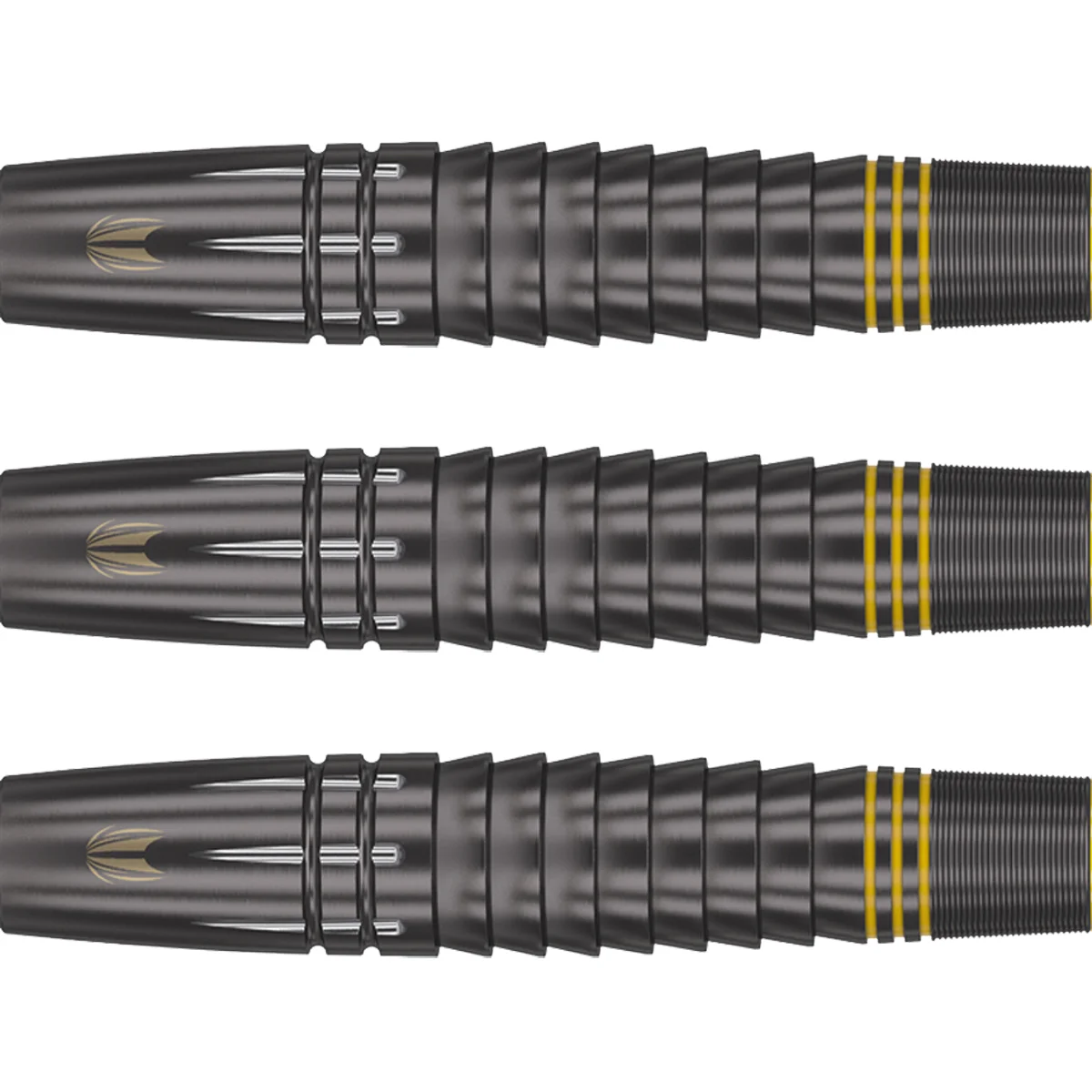 Die neuen Target Scott Williams Black Softdarts mit einem Tungsten-Anteil von 90 %. Die Scott Williams Black Edition Darts überzeugen mit einem Tungsten Anteil von 90% und bieten eine gelungene Kombination aus Haltbarkeit, Balance und elegantem Stil. Der aggressive Sharkgrip im hinteren Teil der hochwertigen Scott Williams Barrels sorgt für einen guten Halt und die pechschwarze Titannitrid-Beschichtung bietet ein optisches Highlight. Das Target Scott Williams Dartset wird mit gelben Target TAG Shafts und Shaggy Flights ausgeliefert.GewichtBarrellängeDurchmesser20g40,5mm7,6mm