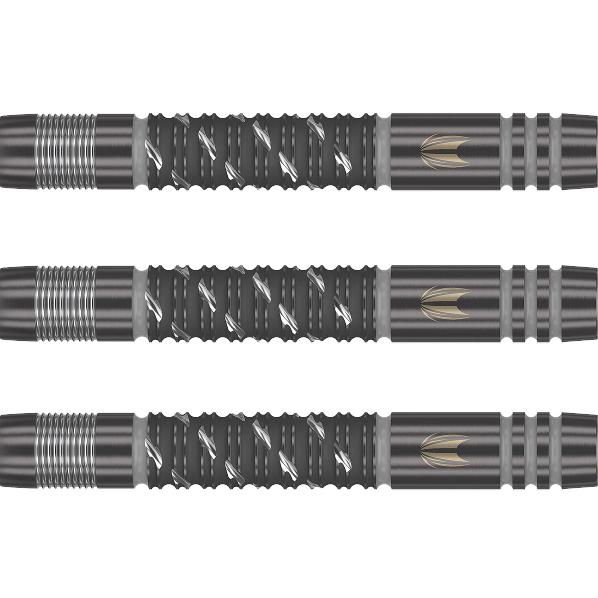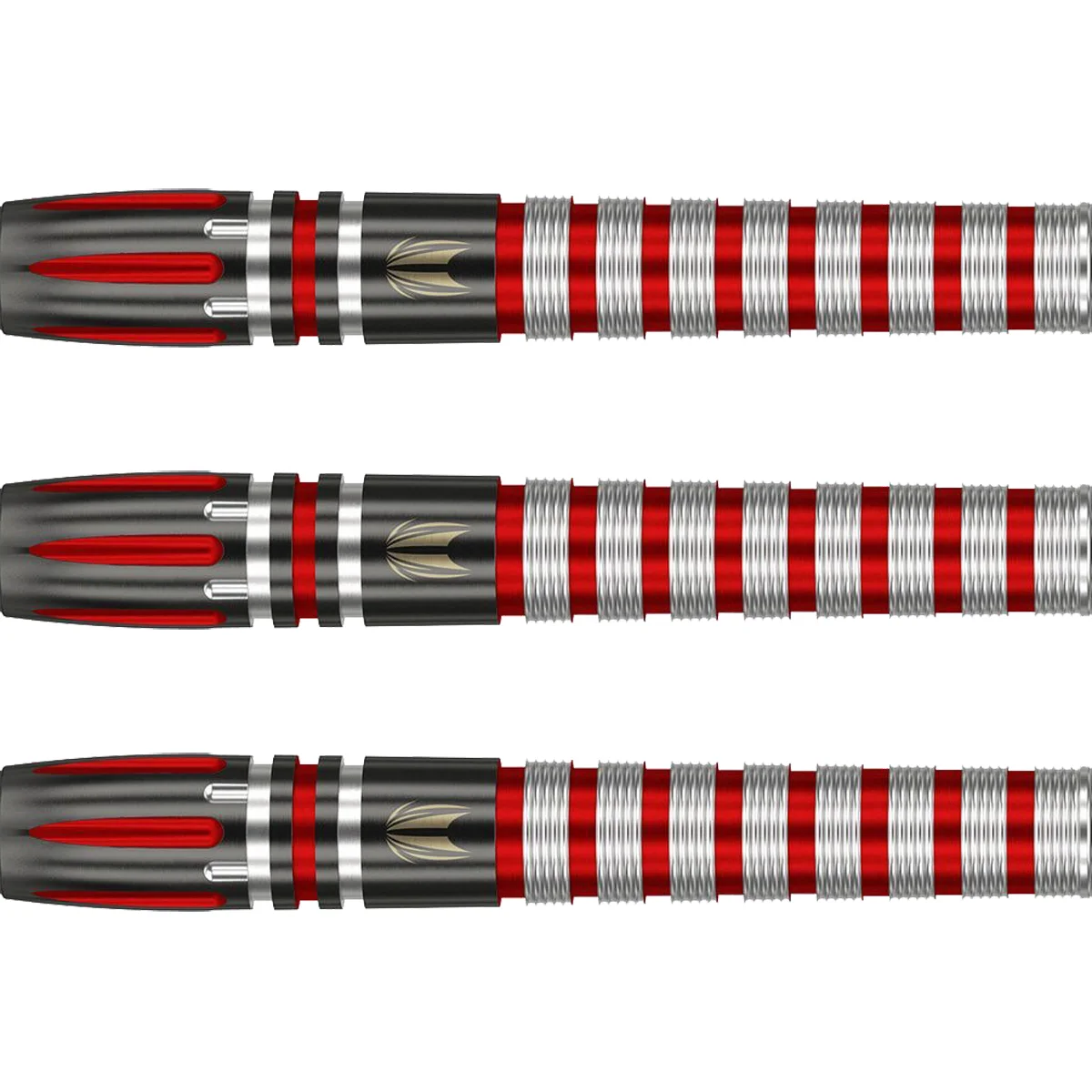 Die neuen Target Nathan Aspinall Softdarts sind von der Form ziemlich identisch mit den Nathan Aspinall Gen1 Darts. Die 90% Tungsten Barrels haben weitere Fräsungen für noch mehr Grip und optimale Kontrolle erhalten. Ein feiner Ringed Grip der mit roten, breiteren Abständen sehr gut und auffällig zur Geltung kommt. Die typische Tropfenform mit vorne liegendem Schwerpunkt wurde beibehalten und entspricht genau den Anforderungen die Nathan Aspinall an seine Darts stellt. Ein weiteres Highlight ist die Verwendung einer schwarzen Titanium Beschichtung welche die Dartpfeile vor äußeren Einflüssen schützt und ihnen gleichzeitig dieses atemberaubende Design verleiht. Neben den hochwertigen Nathan Aspinall Black Edition Softdarts sind auch schwarze Pro Grip Shafts und Pro. Ultra Flights enthalten.GewichtBarrellängeDurchmesser18g48mm6,95mm