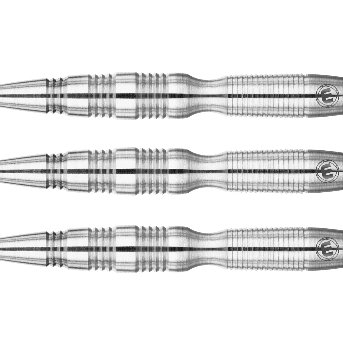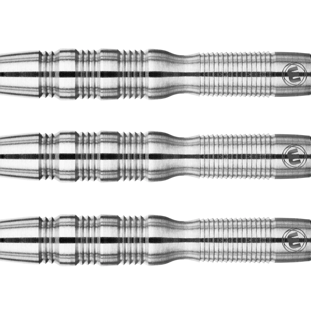 Die Simon Whitlock Natural Softdarts vereinen ein markantes Barrel-Design mit funktionalem Grip – entwickelt für ambitionierte Spieler, die Wert auf Präzision, Charakter und Konsistenz legen. Diese Softdarts wurden in enger Zusammenarbeit mit Simon Whitlock entworfen und überzeugen durch ihren natürlichen Look und ein durchdachtes Griffprofil. Die Barrels bestehen aus 90 % Tungsten und verfügen über eine deutlich sichtbare Griffstruktur, die sowohl funktional als auch optisch Akzente setzt. Besonders auffällig ist die steil ansteigende Griffmulde im vorderen Bereich, die durch eine gezielte Verdickung des Barrels ergänzt wird. Dies sorgt für eine stabile Fingerführung und verbessert die Wiederholbarkeit deines Wurfs – ein echter Vorteil für alle, die an ihrem Spielaufbau arbeiten. Der eingearbeitete Ringed Grip in der Übergangszone zwischen Mulde und Barrelende erhöht die Griffigkeit zusätzlich und gibt dir noch mehr Kontrolle beim Abwurf. Das natürliche Silber-Finish rundet das Gesamtbild der Whitlock Natural Serie ab – klassisch, kraftvoll, kontrolliert. Mit einem Gewicht von 18 g gehören diese Softdarts zur gängigsten Spielklasse und werden mit hochwertigen Shafts und Flights als Komplettset ausgeliefert – sofort bereit für dein nächstes Match. Entwickelt mit Simon Whitlock – 90 % Tungsten Markante Griffmulde mit Verdickung – für präzises Greifen Ringed Grip im hinteren Bereich – zusätzliche Kontrolle Natürliches Silber-Finish – klassisch & funktional 18 g Gewicht – ideal für ambitionierte Softdartspieler Inklusive hochwertiger Shafts & Flights Technische Daten Gewicht Barrellänge Durchmesser (vorn–hinten) 18 g 43,2 mm 7,3–5,3 mm
