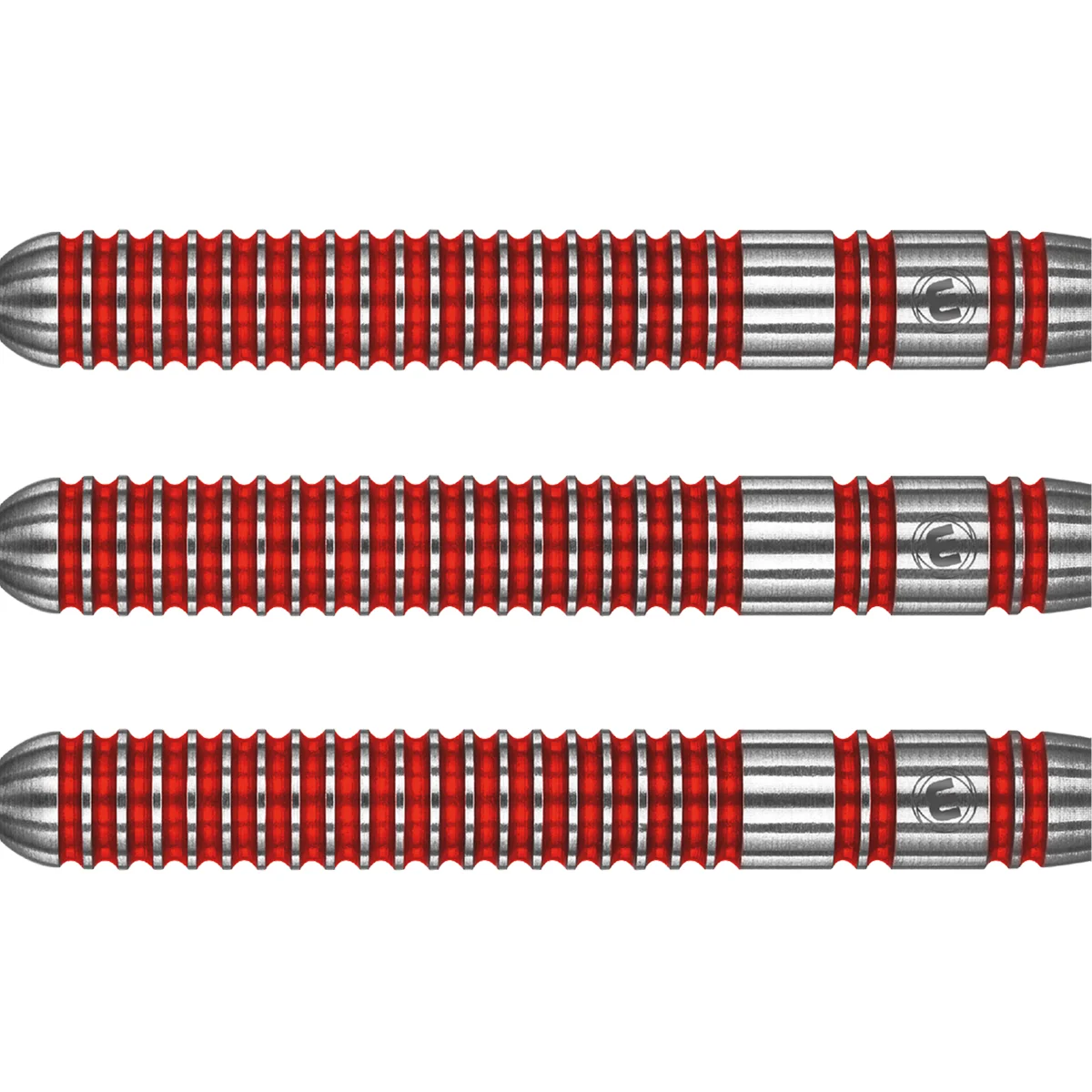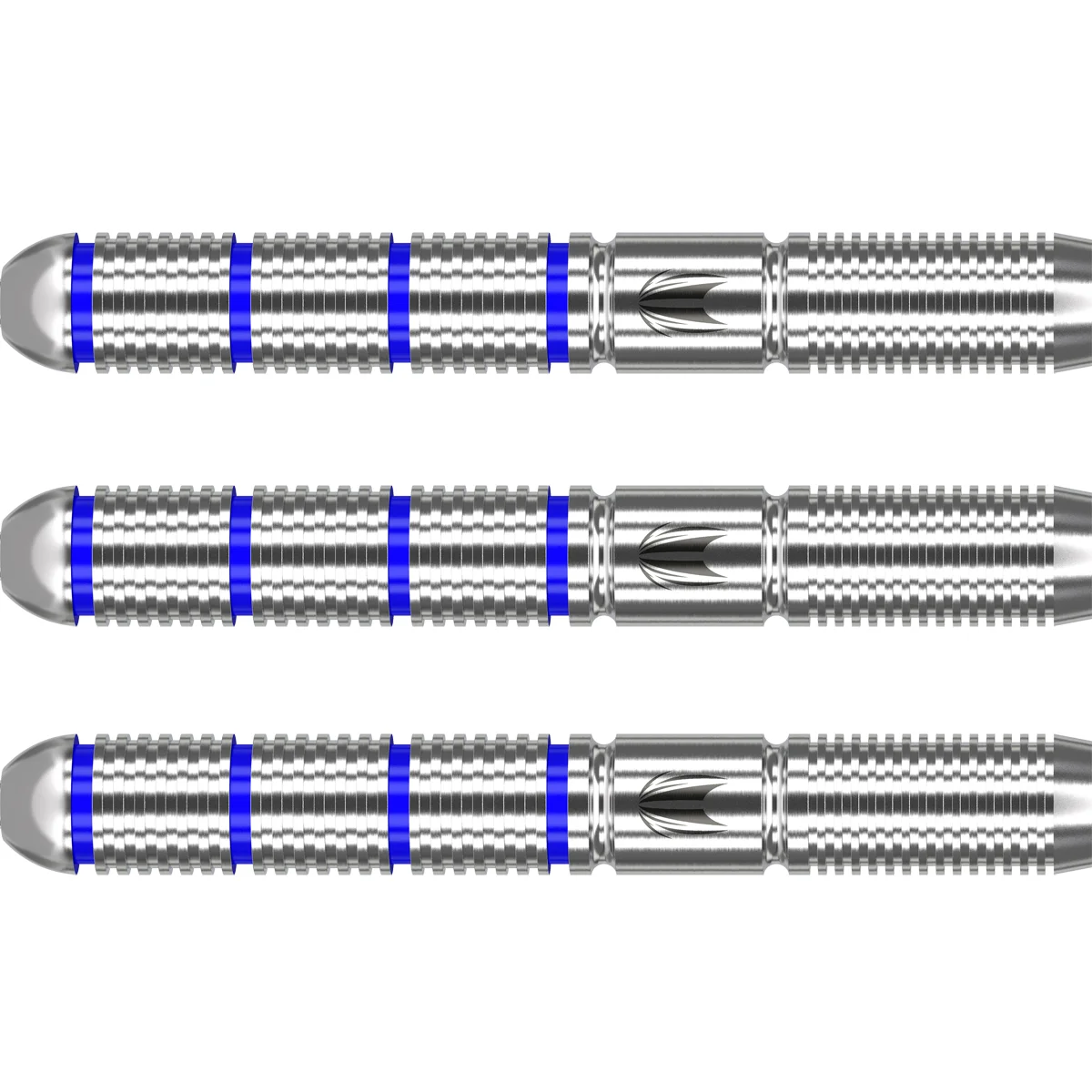 Die Barrel der 80% Glen Durrant Steeldarts haben eine beeindruckende Tungstenanteil von 80% und zeichnen sich durch eine gerade Verlaufende Form aus. Ein durchdachter Ringed Grip wurde nahezu auf der gesamten Oberfläche der Darts eingearbeitet, um eine komfortable Handhabung und einen konstanten Grip zu gewährleisten. Der vordere Gripbereich ist in drei präzise gestaltete Segmente unterteilt, die durch eine breitere Ausarbeitung mit blauer Einlassung gekennzeichnet sind. Diese sorgen für eine exzellente Griffigkeit und Kontrolle. Der folgende Classic Tungsten Bereich ist mit dem eingelaserten Target und Duzza Logo verziert, was diese Darts noch individueller macht. Ein zusätzlicher Ringed Grip Abschnitt am hinteren Teil der Darts rundet das Design ab und gewährleistet einen sicheren Halt bei jedem Wurf. Die Neuen Target Glen Durrant Steeldarts sind perfekt abgestimmt in den Farben Blau und Silber, eine Kombination, die Eleganz und Stil ausstrahlt. Das Dartset wird komplettiert durch die hochwertigen Target Pro Grip Shafts und die neuen Glen Durrant Flights, die natürlich inklusive sind.GewichtBarrellängeDurchmesser21g52mm6,4mm23g52mm6,7mm