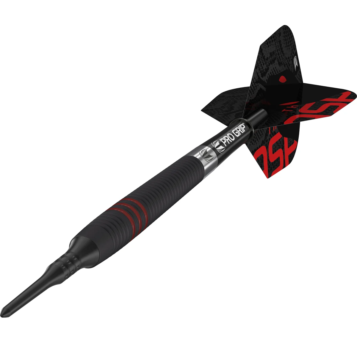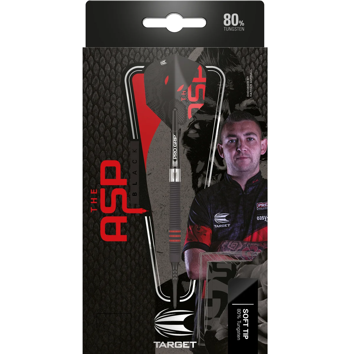 Neue Nathan Aspinall Black Softdarts mit einem Tungstenanteil von 80% in der, von "The Asp" bevorzugten, leichten Torpedoform. Die Darts haben eine sehr große Ringed Grip Fläche um sie an verschiedenen Stellen, je nach eigenem Wurfstil, greifen und kontrollieren zu können. Die Barrels sind auf Grund der Form ein wenig Frontlastig und damit sehr gut für gefühlvollere Werfer geeignet. Die eingefärbten Roten Ringe heben sich sehr schön von den schwarz beschichteten Barrels ab und setzen optische Akzente.
