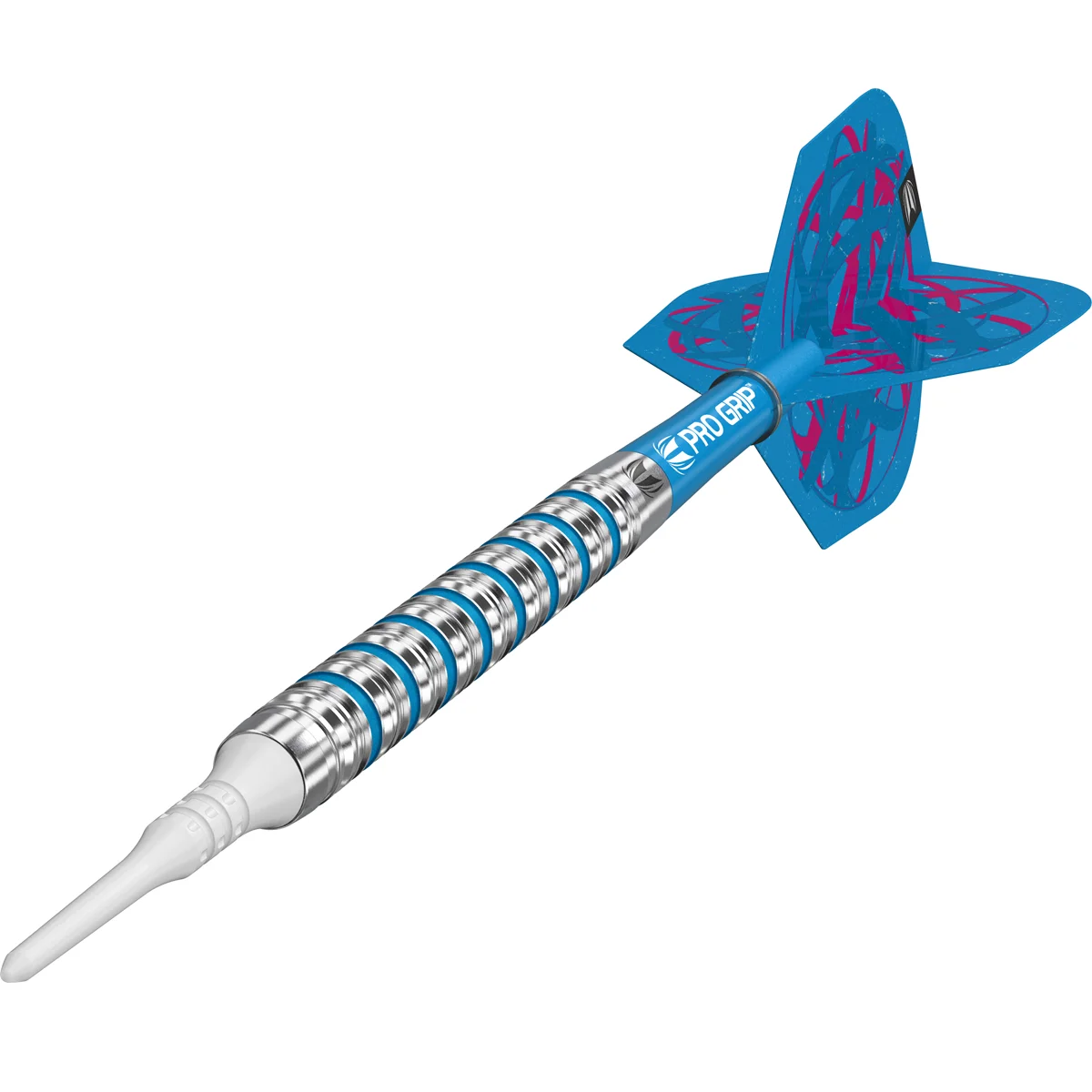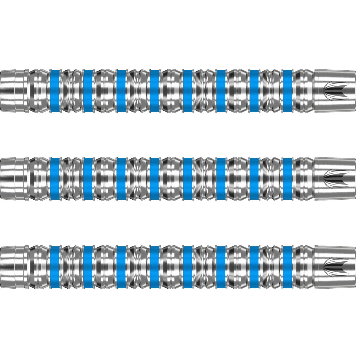 Das Modell ORB 11 von Target ist mittig ausbalanciert. Die Gripfläche erstreckt sich über den kompletten Dartkörper und weist verschieden breite Ringe auf. Das elegante Design aus silber und blau vollendet das eingelaserte Target Logo mit farblich passenden Pro Grip Shafts und den neuen ORB Flights in N°6 Form.