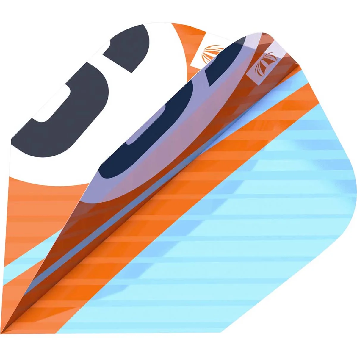 100 Mikron starke Target Pro Ultra Chicane Flights in der schmalen Shape Form N°6 mit einem abstrakten, orangen Motiv als 3-Pack Set.