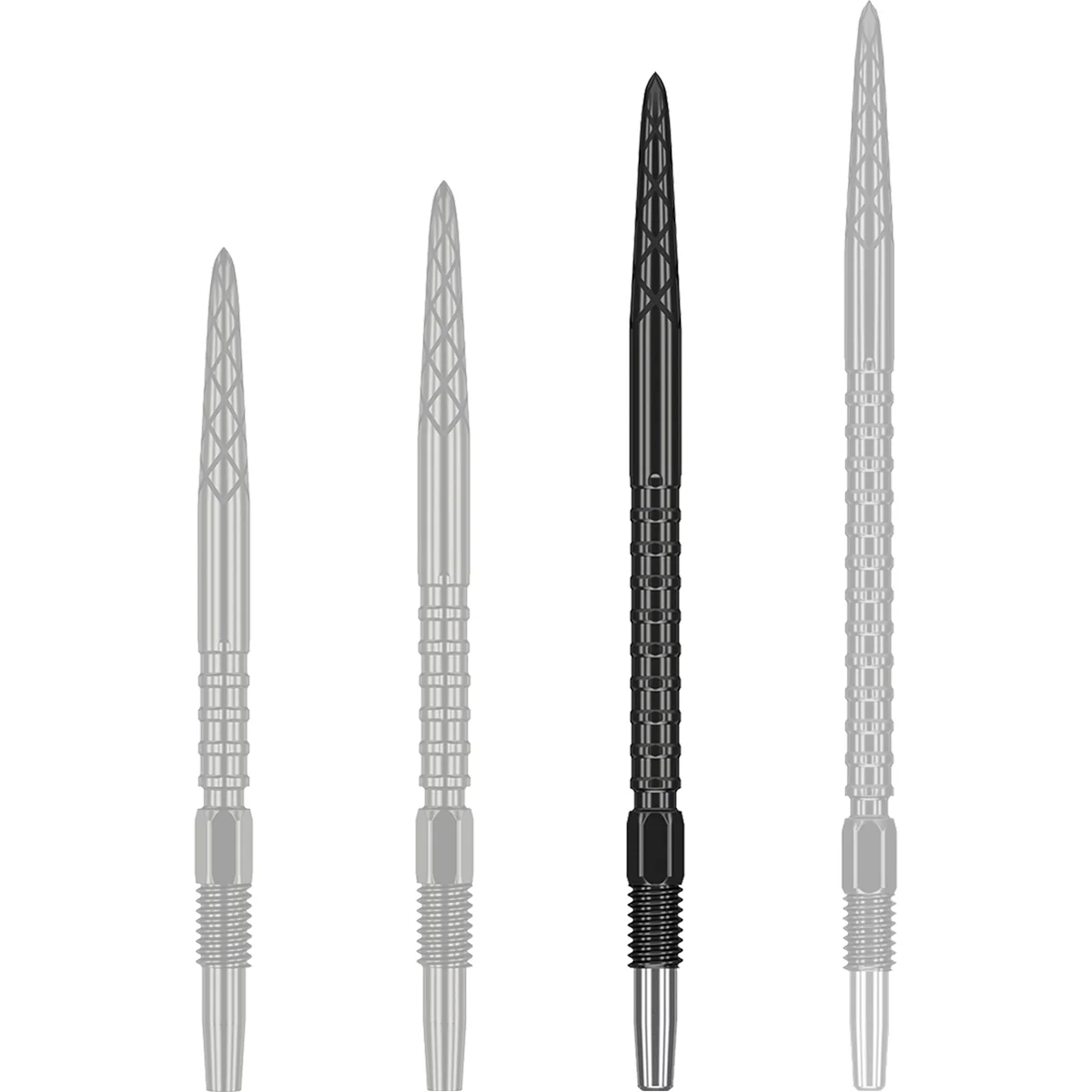 Die Spitzen sind in zwei Hauptbereiche unterteilt. Der obere Teil hat die sehr beliebte Diamond Fräsung eingearbeitet die einen festen Halt in der Dartscheibe ermöglicht. Benannt ist diese Fräsungen nach dem Muster das an die Form von Diamanten erinnert. Bevor der Abschnitt mit den tieferen Rillen kommt sind die Surge Spitzen noch ein kleines Stück und unbearbeitet. Die tieferen Rillen die bis zum patentierten Swiss Point Gewinde reichen sind ein toller Anhalts- und Orientierungspunkt für Spieler die einen Finger zum zielen auflegen.