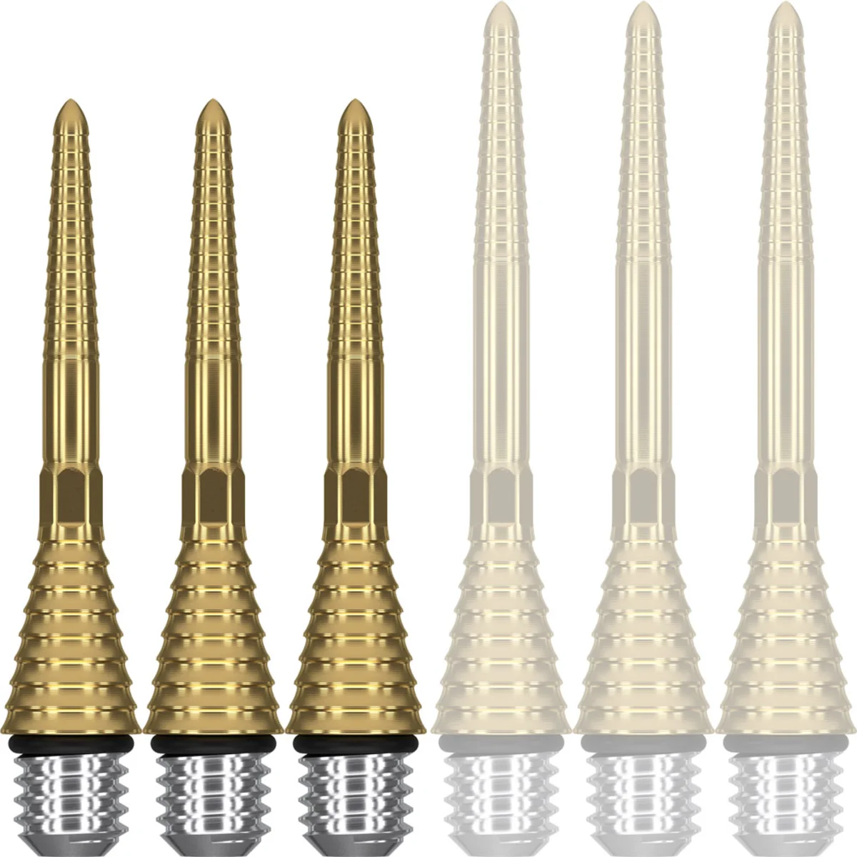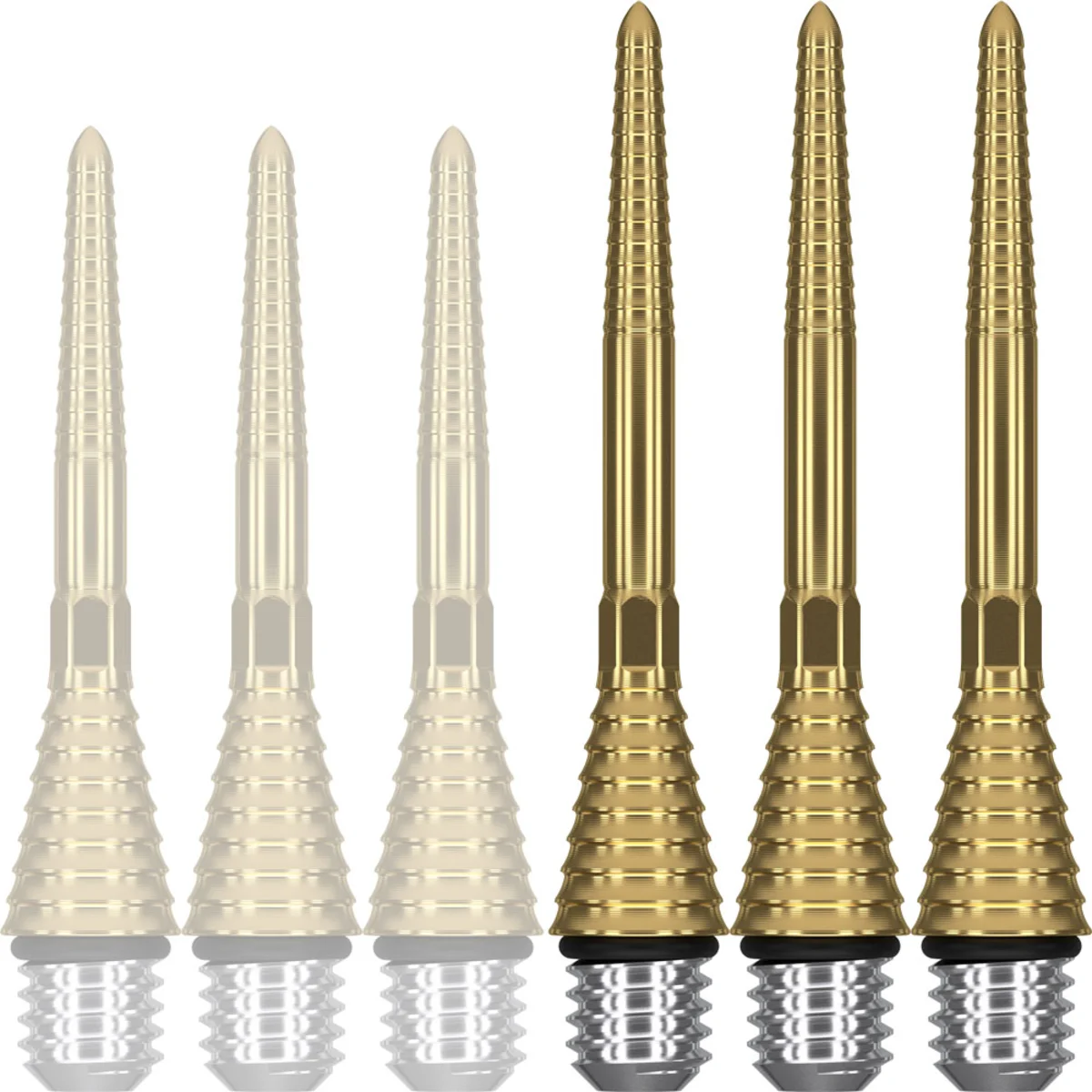 Die neuen Target Swiss Point Grooved Conversion Points gold bestehen aus ultraleichtem Titanium was zum einen extrem robust macht und zum anderen vom Gewicht kaum ein Unterschied zu den gewohnten Softdartspitzen festzustellen ist. Am vorderen Teil ist ein abgerundeter Shark Grip der sich schon auf vielen anderen Modellen bewährt hat da er einen extremen Halt in der Dartscheibe bietet und Bouncer enorm reduziert. Der gleiche Grip findet sich auch auf dem Kegel oberhalb des Gewindes für Spieler die gerne einen Finger dort auflegen. Softdarts zu Steeldarts umbauen ganz einfach!