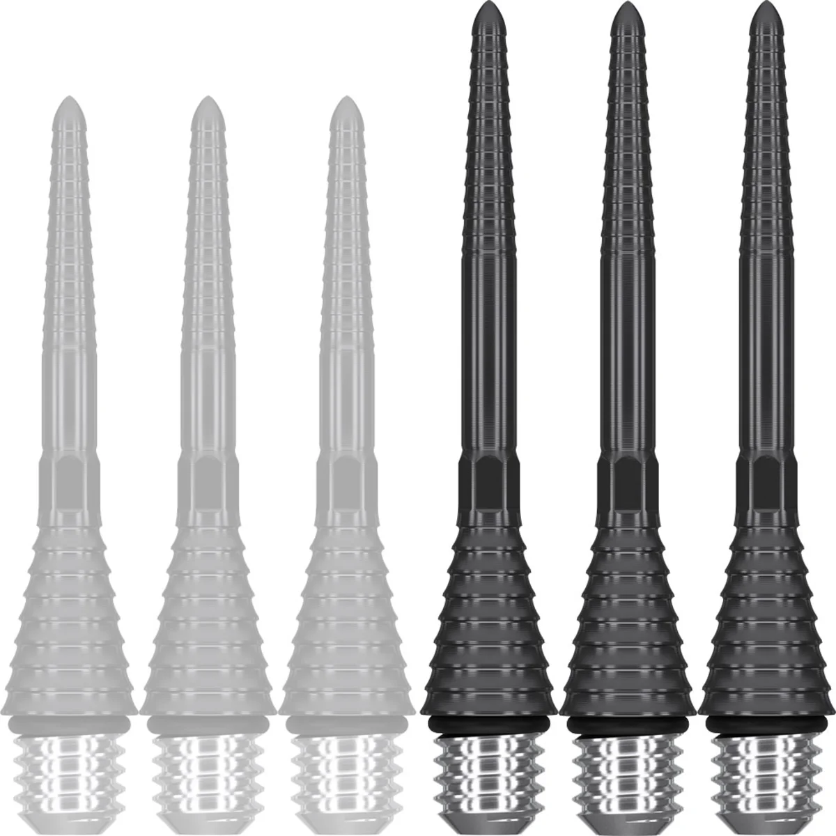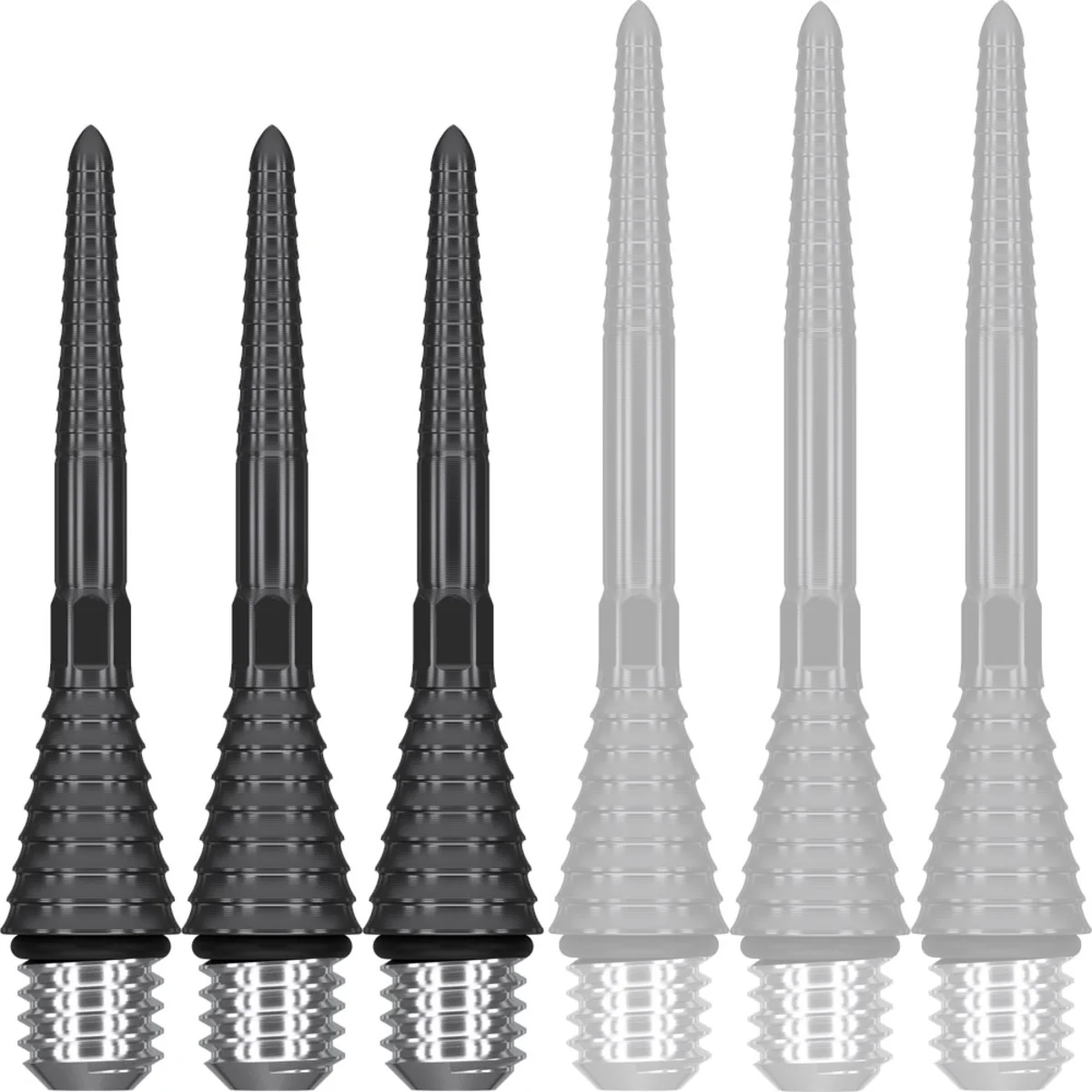 Die neuen Target Swiss Point Grooved Conversion Points schwarz bestehen aus ultraleichtem Titanium was zum einen extrem robust macht und zum anderen vom Gewicht kaum ein Unterschied zu den gewohnten Softdartspitzen festzustellen ist. Am vorderen Teil ist ein abgerundeter Shark Grip der sich schon auf vielen anderen Modellen bewährt hat da er einen extremen Halt in der Dartscheibe bietet und Bouncer enorm reduziert. Der gleiche Grip findet sich auch auf dem Kegel oberhalb des Gewindes für Spieler die gerne einen Finger dort auflegen. Softdarts zu Steeldarts umbauen ganz einfach!
