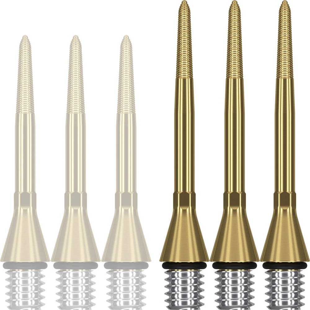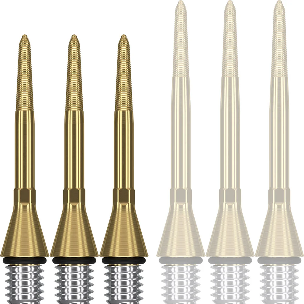 Die neuen Target Swiss Point Nano Conversion Points gold bestehen aus ultraleichtem Titanium was zum einen extrem robust macht und zum anderen vom Gewicht kaum ein Unterschied zu den gewohnten Softdartspitzen festzustellen ist. Am vorderen Bereich ist der beliebte Nano Grip der sich schon auf vielen anderen Modellen bewährt hat da er das Dartboard nicht zu sehr beansprucht und einen festen Halt der Darts im Board bietet. Der Nano Grip findet sich auch auf dem Kegel oberhalb des Gewindes für Spieler die gerne einen Finger dort auflegen. Softdarts zu Steeldarts umbauen ganz einfach!