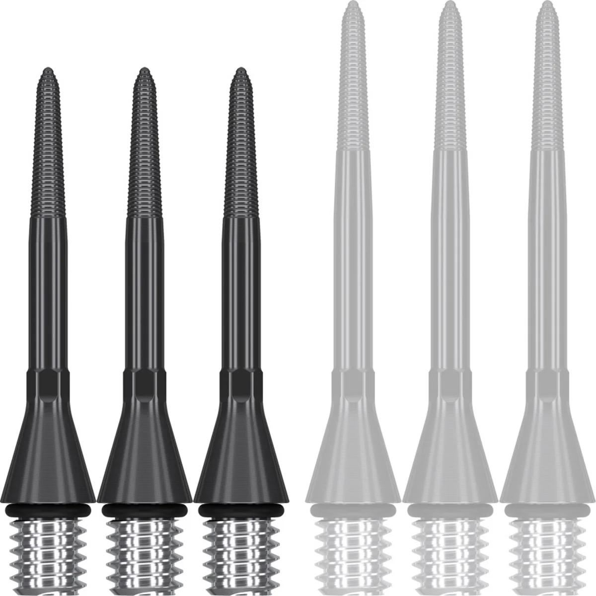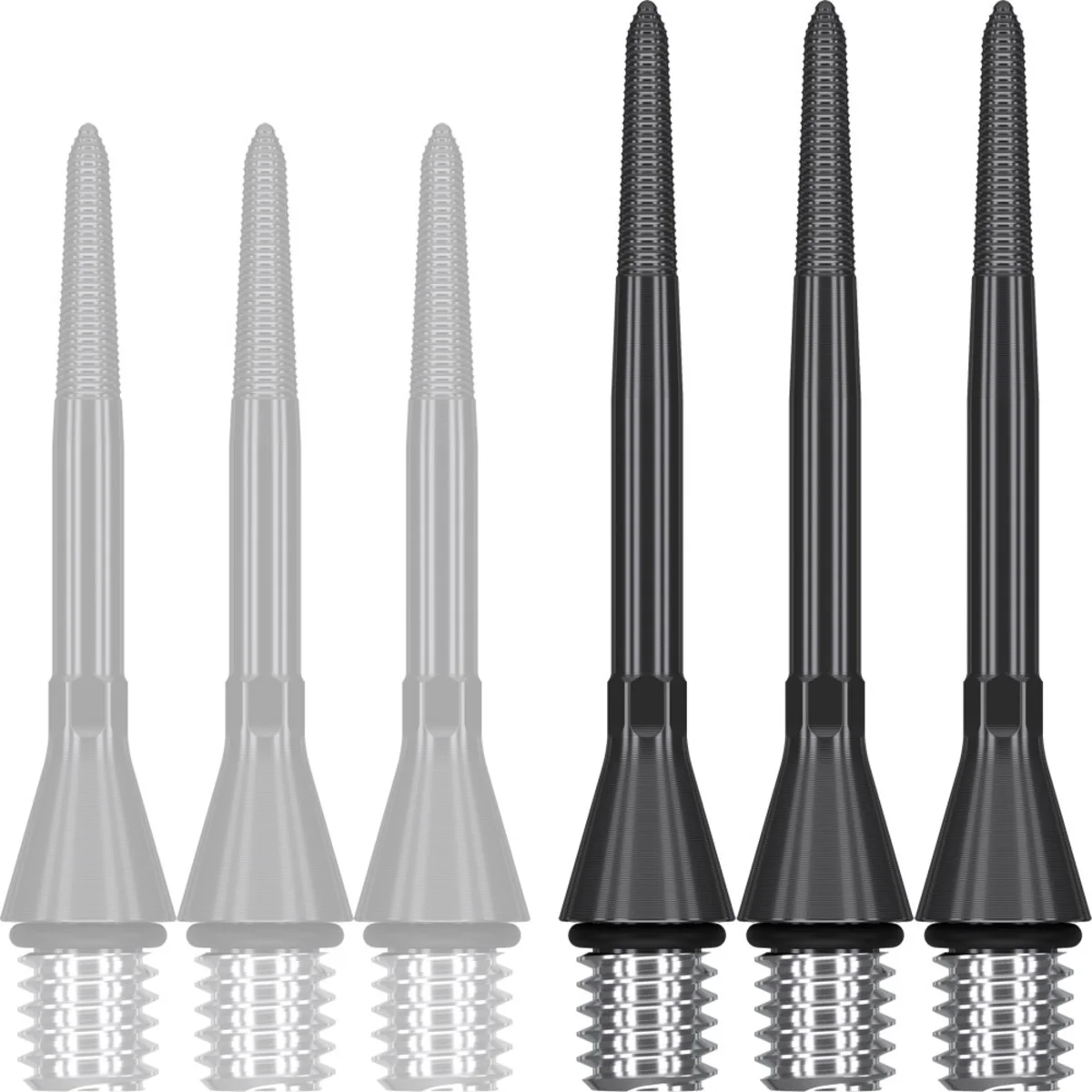 Die neuen Target Swiss Point Nano Conversion Points schwarz bestehen aus ultraleichtem Titanium was zum einen extrem robust macht und zum anderen vom Gewicht kaum ein Unterschied zu den gewohnten Softdartspitzen festzustellen ist. Am vorderen Bereich ist der beliebte Nano Grip der sich schon auf vielen anderen Modellen bewährt hat da er das Dartboard nicht zu sehr beansprucht und einen festen Halt der Darts im Board bietet. Der Nano Grip findet sich auch auf dem Kegel oberhalb des Gewindes für Spieler die gerne einen Finger dort auflegen. Softdarts zu Steeldarts umbauen ganz einfach!