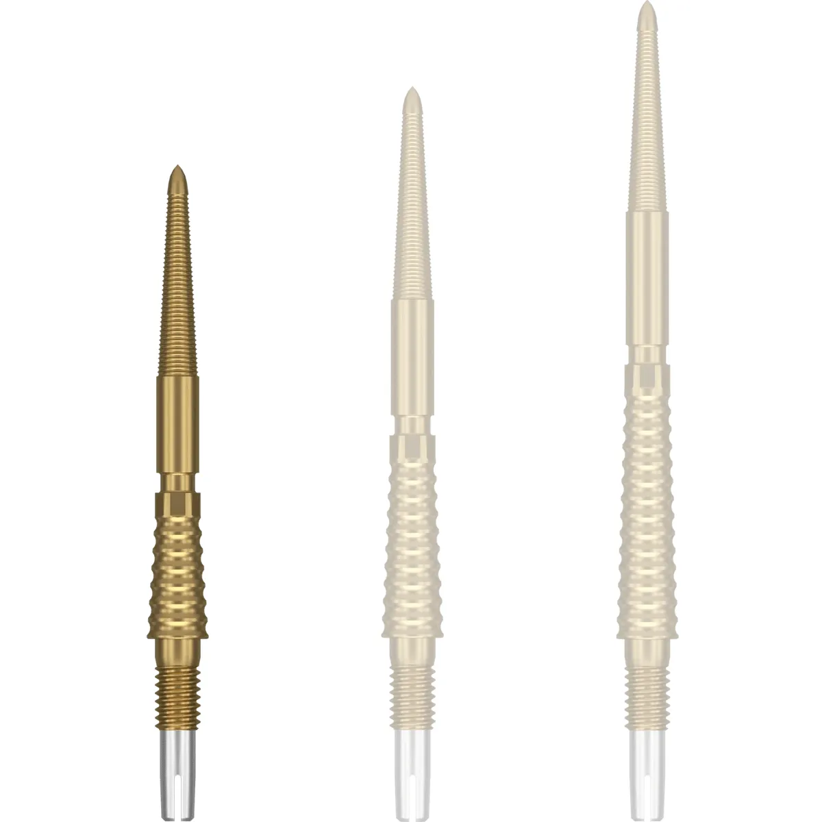 Die goldenen Swiss Point Storm LNC Steeldartspitzen bieten einen angenehmen Fingergrip für Spieler die einen Finger auf die Spitze legen und einen feinen Boardgrip der für sicheren Halt im Dartboard sorgt ohne dieses zu beschädigen. Die Dartspitze wird zum Ende hin ein wenig dicker und sorgt für einen optimalen Übergang und weniger Bouncer.