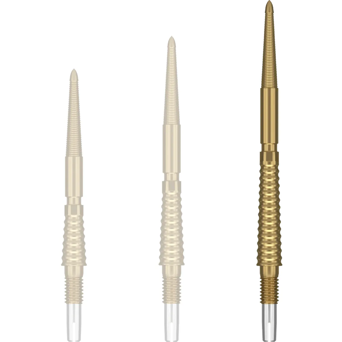 Die goldenen Swiss Point Storm LNC Steeldartspitzen bieten einen angenehmen Fingergrip für Spieler die einen Finger auf die Spitze legen und einen feinen Boardgrip der für sicheren Halt im Dartboard sorgt ohne dieses zu beschädigen. Die Dartspitze wird zum Ende hin ein wenig dicker und sorgt für einen optimalen Übergang und weniger Bouncer.
